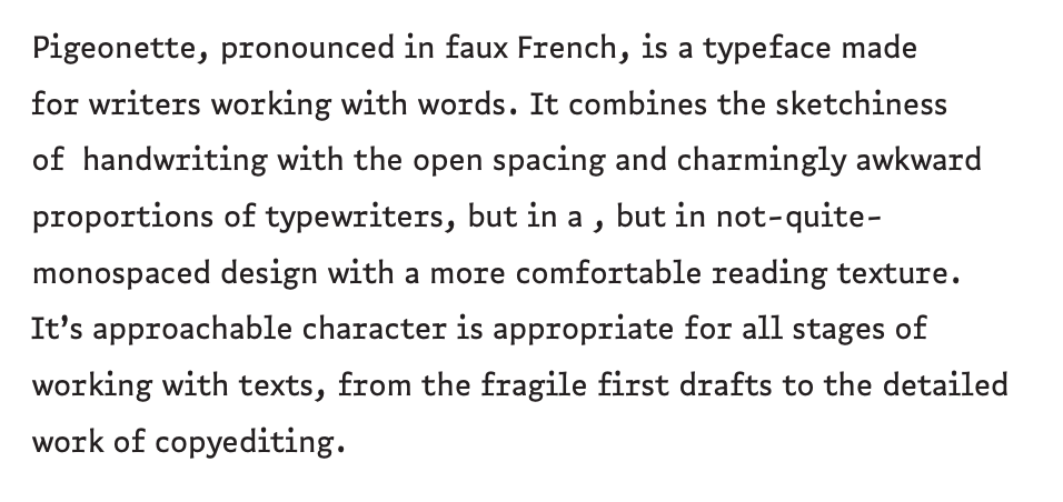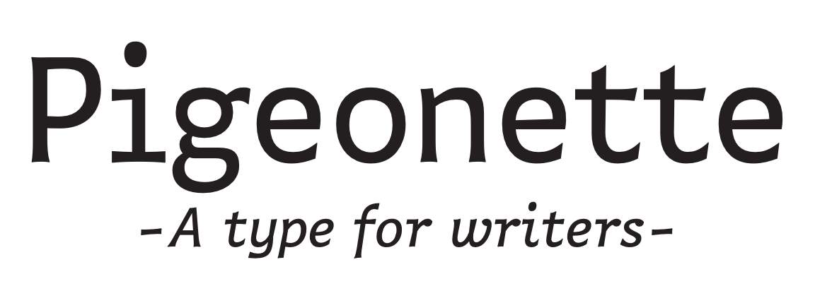 I'm writing my current project, The Dark Age, with Pigeonette, a beautiful, quirky, almost monospace font by Ro Hernández.